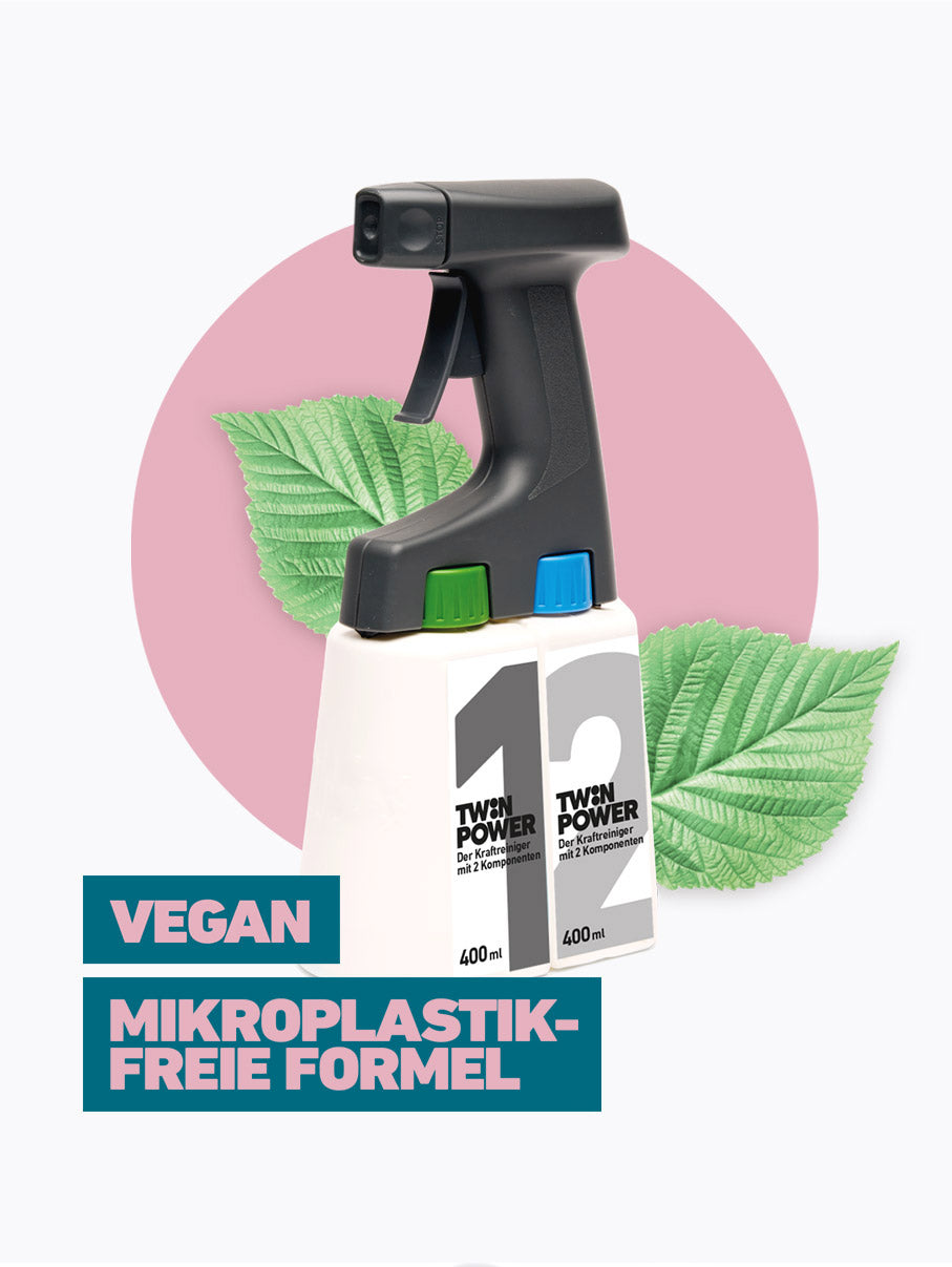 Im Gegensatz zu anderen Reinigern besteht Twin Power aus 2 Komponenten, die durch die spezielle Sprühflasche erst auf der Oberfläche miteinander reagieren. Bei der Reaktion der Komponenten entsteht aktiver Sauerstoff, der organische Verschmutzungen löst und zersetzt. Die Reaktionsprodukte sind Wasser, Sauerstoff und Natriumcarbonat - ein biologisch abbaubares Salz. Die Reaktion ist also umweltneutral.