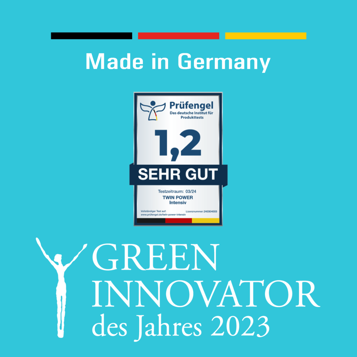 Für unsere patentierte Formel wurde unser Unternehmen mit dem Green Innovator des Jahres 2023 ausgezeichnet. Zusätzlich wurde Twin Power intensiv von Prüfengel - dem deutschen Institut für Produkttests - mit der Note 1,2 ausgezeichnet.