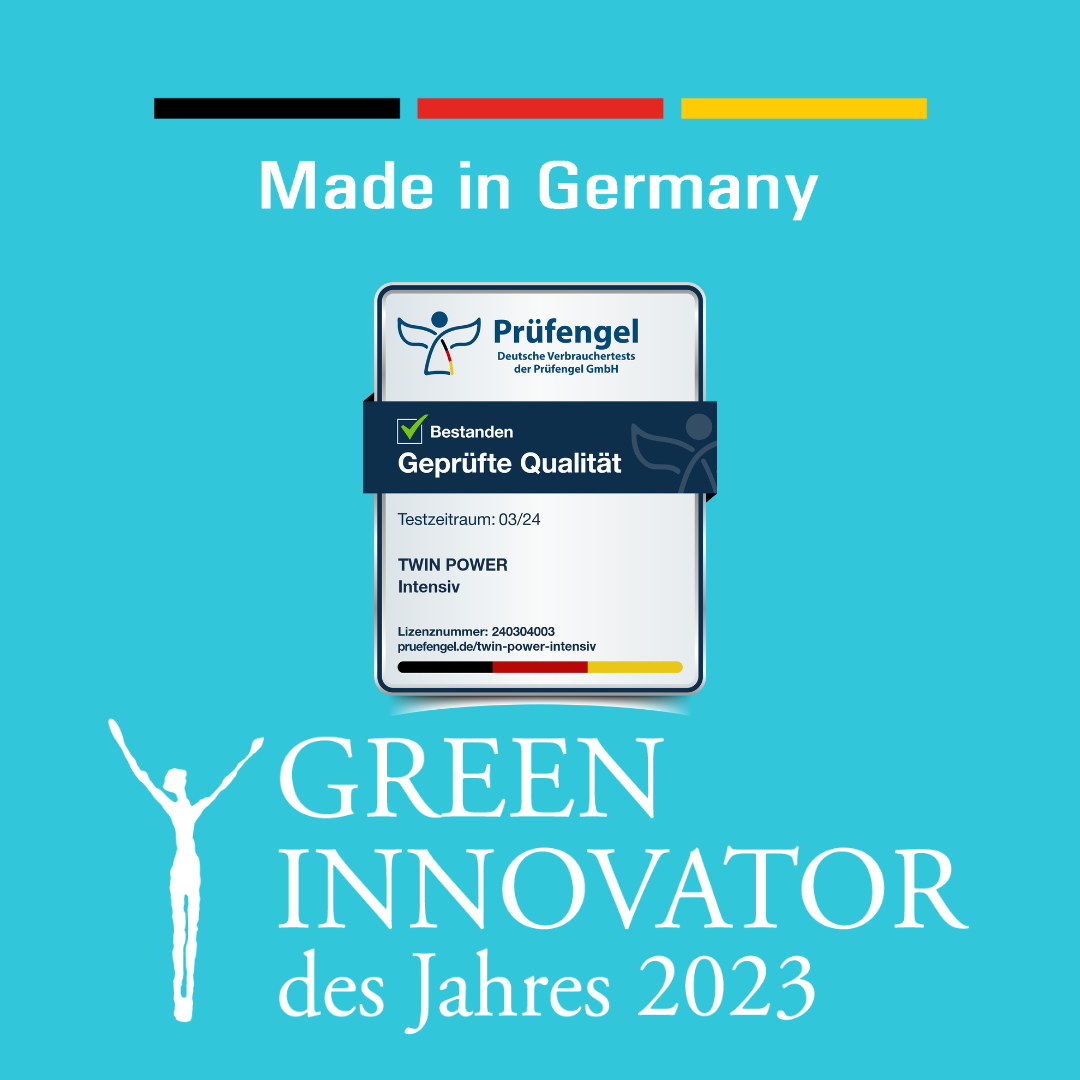 Für unsere patentierte Formel wurde unser Unternehmen mit dem Green Innovator des Jahres 2023 ausgezeichnet. Zusätzlich wurde Twin Power Intensiv von Prüfengel - dem deutschen Institut für Produkttests - mit ausgezeichneter Qualität geprüft.