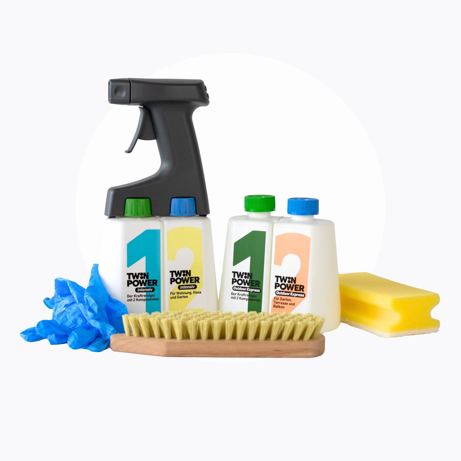 Mit unserem Kombi Set Haus & Garten bekommst du die geballte Power unserer Reiniger nach Hause. Enthalten sind in diesem Set unser robuster wiederverwendbarer Twin Sprayer, je ein Set Twins von Outdoor Express & intensiv, eine Bürste, Schwamm und Handschuhe. So sparst du nicht nur Geld sondern auch Ressourcen. Den Sprayer kannst du nach der Reinigung einfach rausschrauben, ausspülen und für den anderen Twin Power-Reiniger verwenden.