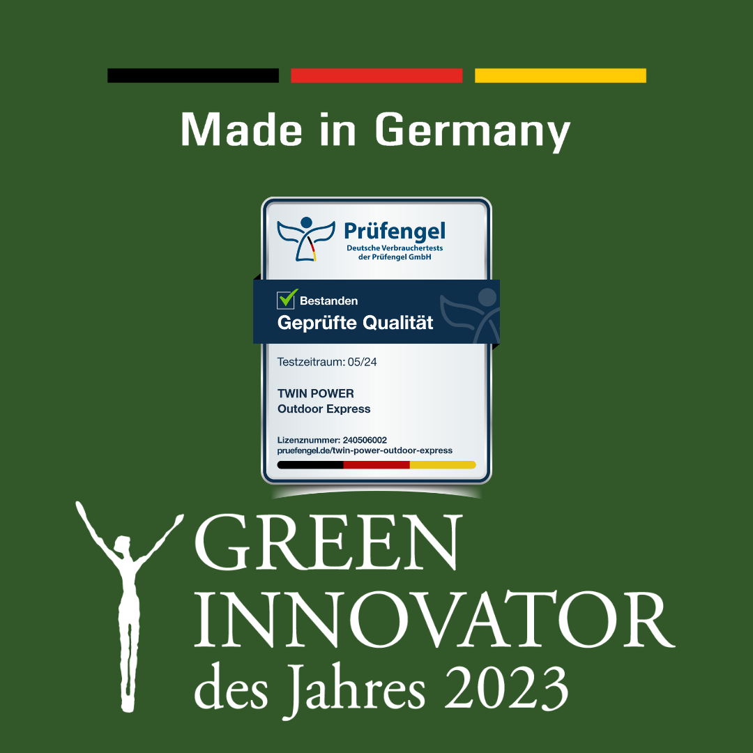 Für unsere patentierte Formel wurde unser Unternehmen mit dem Green Innovator des Jahres 2023 ausgezeichnet. Zusätzlich wurde Twin Power Outdoor Express von Prüfengel - dem deutschen Institut für Produkttests - mit ausgezeichneter Qualität geprüft.