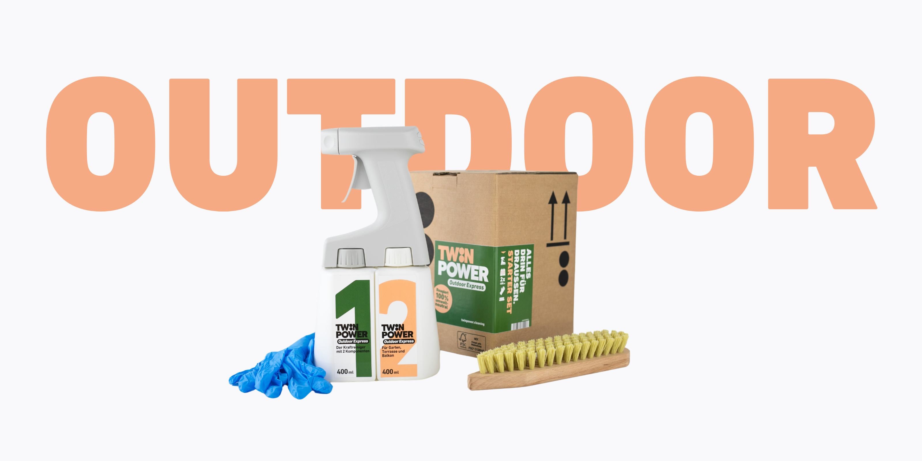 Dein Reiniger für den Outdoor Bereich. Entferne pflanzliche Rückstände, frische Ölflecken oder reinige durch Witterung verunreinigte Gartenfiguren, Sonnenschirme und mehr. Mach deinen Garten bereit für den Sommer mit Twin Power Outdoor Express!